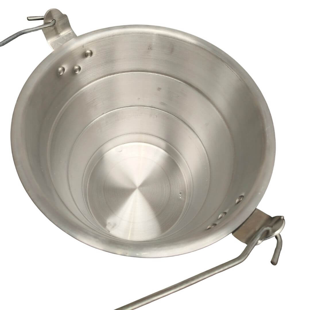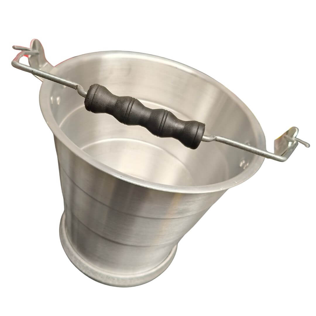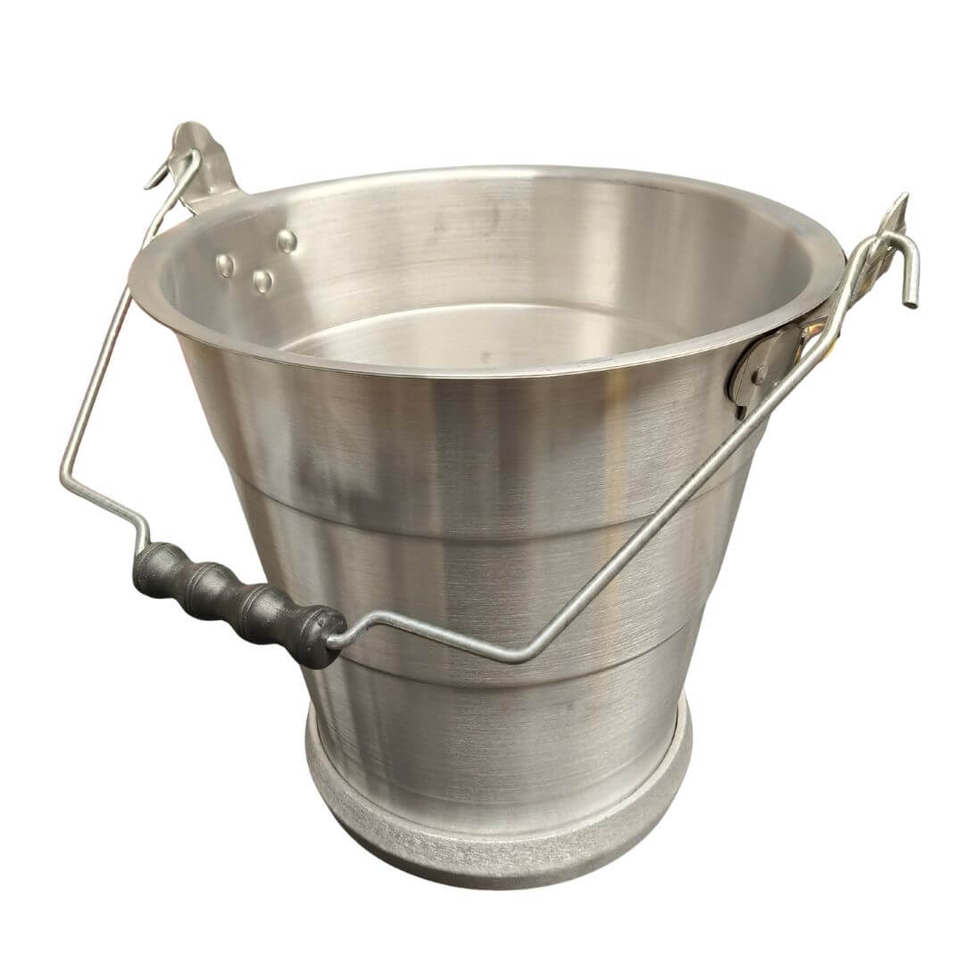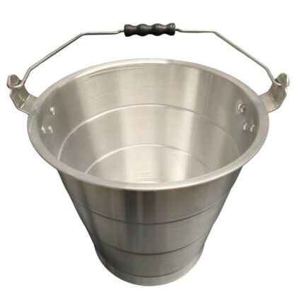 Fabricado en aluminio pulido de alta resistencia con asa metálica reforzada abatible, con dimensiones aproximadas de 30.5 cm de alto (35 con las asas), 30 cm diámetro superior, 38 de largo (diámetro + asas) 22 cm diámetro de la base, con capacidad de 11 litros y anillo en la base para mayor estabilidad. Ideal para transportar agua, almacenar líquidos o realizar labores domésticas.
