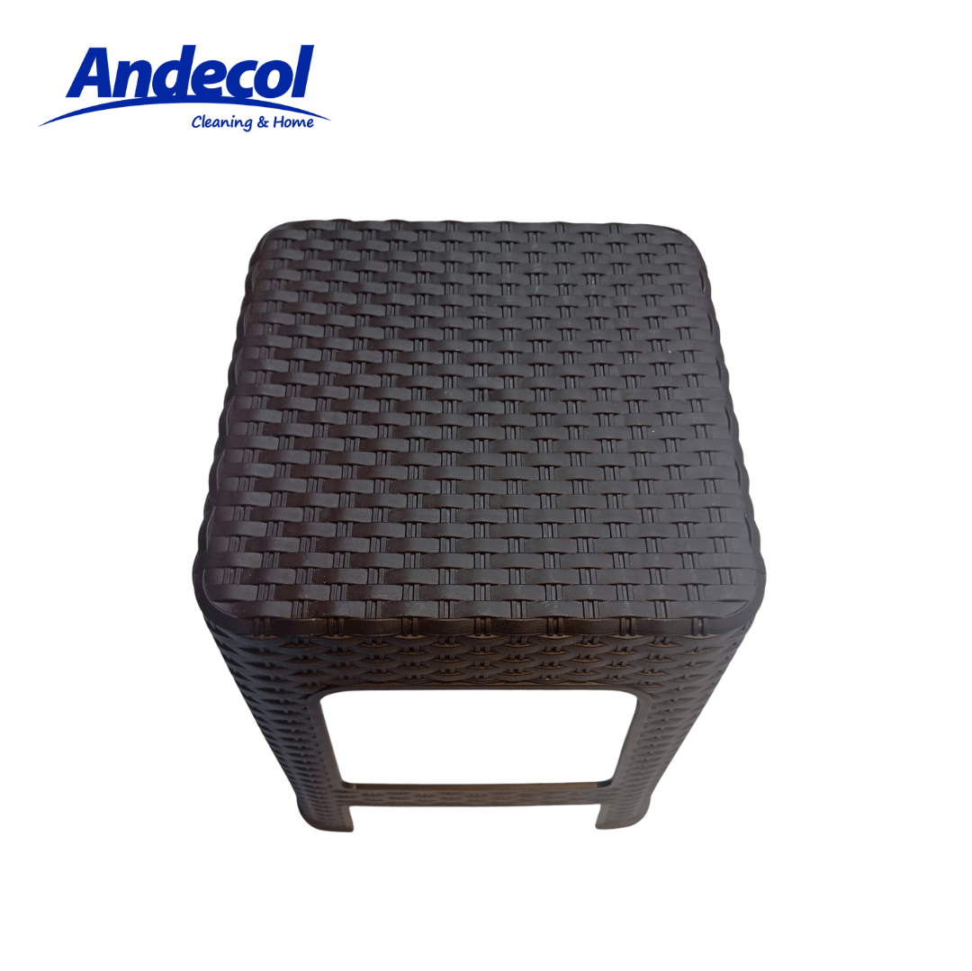 BUTACO TIPO RATTAN WENGUE REF: MP0997; butaco individual de diseño tipo rattan fabricado en plástico resistente de alta durabilidad, con dimensiones de 46 cm de alto, 36 cm de ancho y 36 cm de largo,marca Andecol. Cuenta con 1 nivel de asiento diseñado para 1 persona, soportando una capacidad de carga hasta 80 kg, lo que garantiza estabilidad y seguridad en el uso diario. Es un producto portátil, liviano y fácil de trasladar, no plegable ni desarmable. Su material plástico tipo rattan ofrece resistencia al uso frecuente y fácil limpieza. Ideal para utilizar en cocina, baño, lavandería, patio o espacios interiores, recomendado para sentarse en superficies planas y secas, evitando sobrecargas para prolongar su vida útil y mantener su estructura firme y funcional.