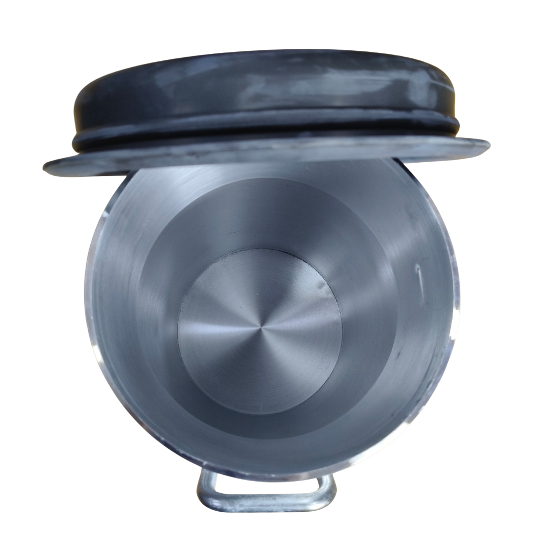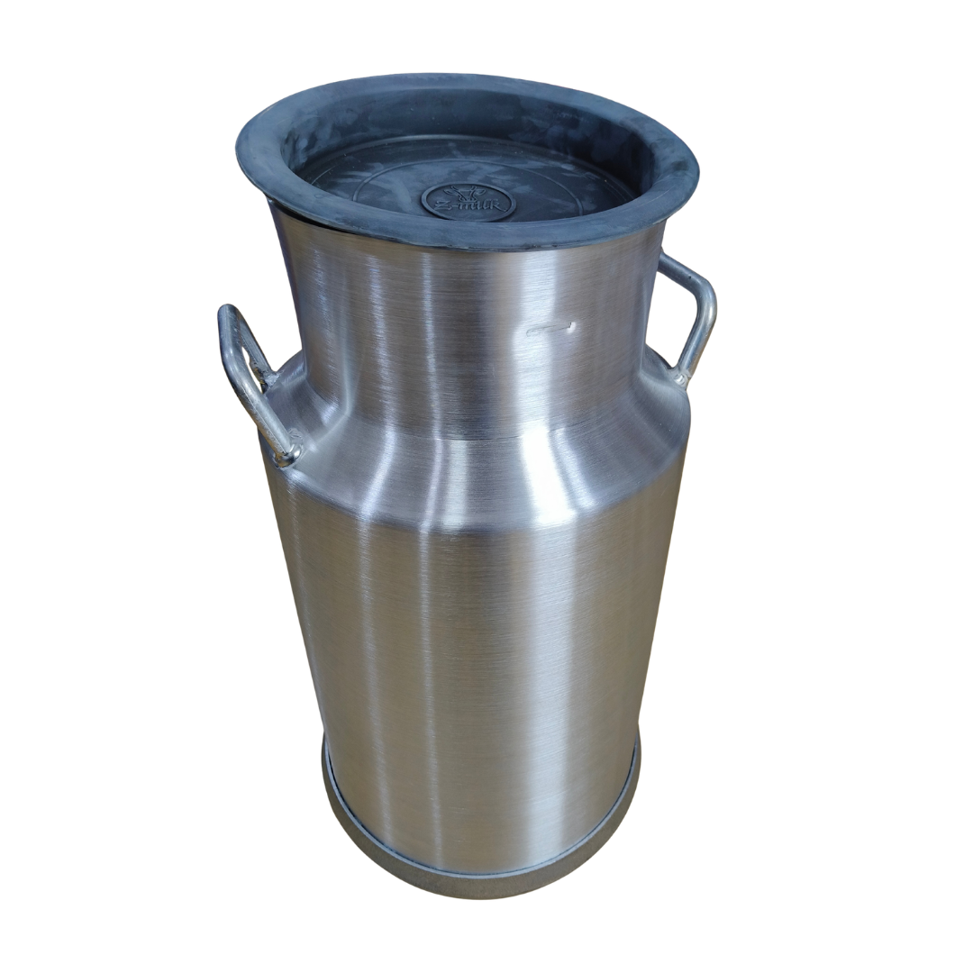 fabricado en aluminio pulido de alta resistencia, con dimensiones aproximadas de 85 cm de alto, 40 cm de ancho, 40 cm de largo, capacidad aproximada de 40 litros y tapa de caucho de cierre ermetico, estructura reforzada con base elevada, dos asas laterales soldadas para transporte seguro, ideal para almacenar y transportar leche, agua u otros líquidos en entornos agroindustriales.