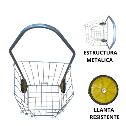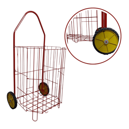 Carro de mercado plegable con estructura metálica y bolsa de tela color rojo. Cuenta con dos ruedas plásticas de gran tamaño que facilitan su desplazamiento, incluso en superficies irregulares. Su armazón está fabricado en tubo metálico resistente, con soporte trasero que permite mantener el carro en posición vertical cuando no se usa.