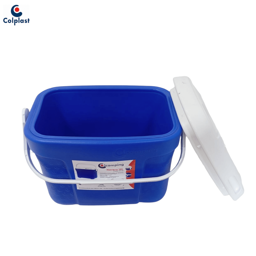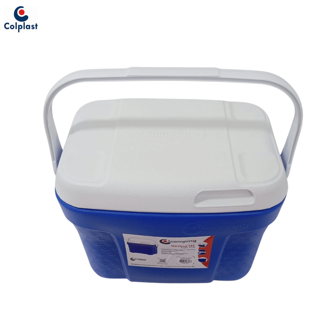 CAVA NEVERA 16 LITROS AZUL REF; 897 COLPLAST; fabricada en polipropileno de alta dencidad con dimenciones de 35 cm de alto, 43 de ancho, 27 cm de largo. Su estructura en color azul con tapa blanca incluye un único compartimiento interno de gran capacidad (hasta 16 litros), . Es un producto portátil, diseñado con asas integradas que facilitan su transporte y un cuerpo compacto que mantiene el frío por hasta 12 horas según condiciones de uso. Perfecta para actividades al aire libre como playa, camping, picnics o viajes por carretera, permite conservar bebidas, frutas y alimentos frescos de forma segura. Para un mejor rendimiento, se recomienda precooler con hielo o geles refrigerantes, mantener la tapa cerrada y ubicarla en zonas sombreadas para prolongar el frío.