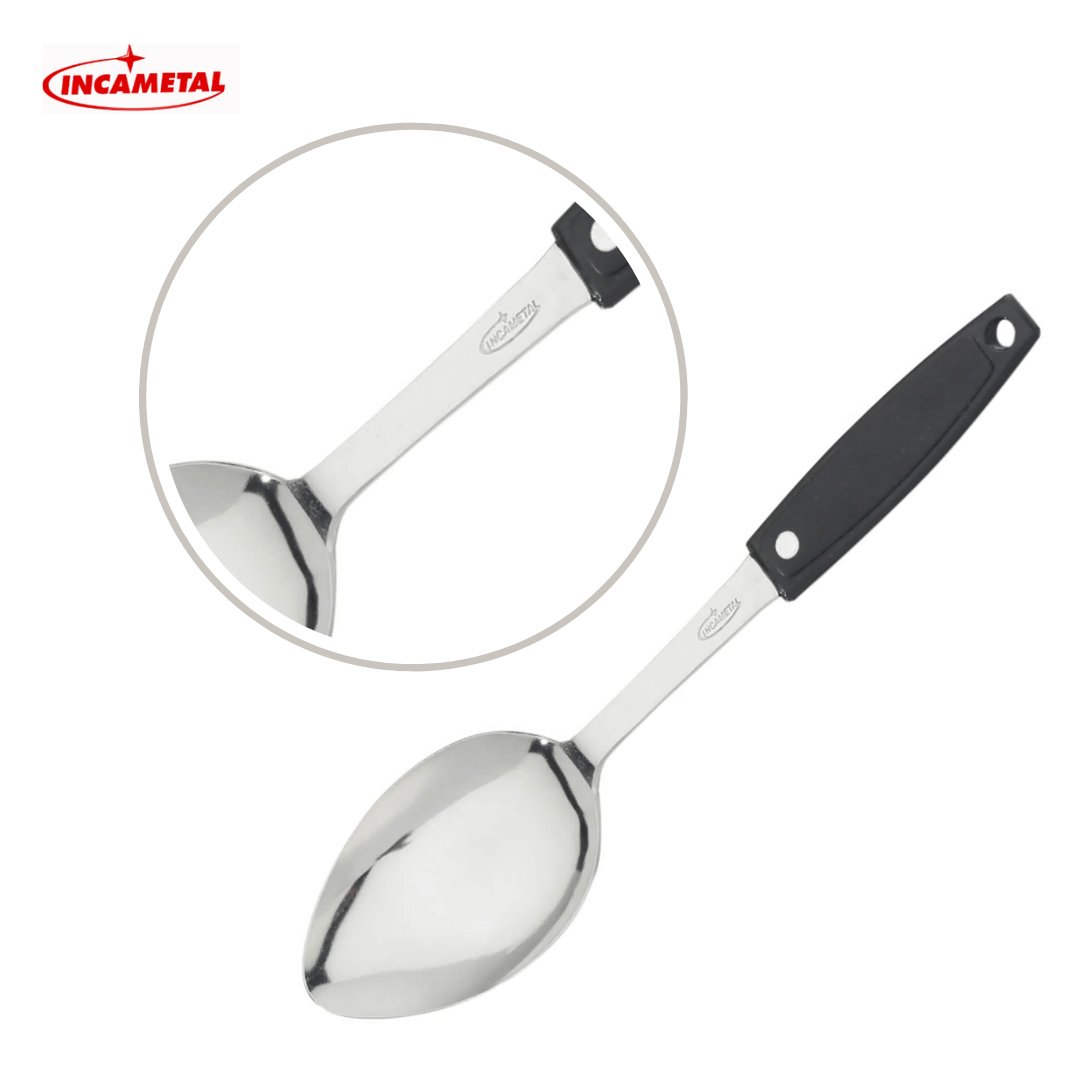 CUCHARA 1000 ANDINA MG PL EXH INCAMETAL REF; I20020; Presenta dimensiones aproximadas de 32 cm, 6 cm de ancho, utensilio resistente y ergonómico diseñado para uso intensivo en cocina profesional o doméstica. Fabricada en acero inoxidable de alta calidad con mango en polipropileno negro, ofrece gran durabilidad y resistencia al calor y la corrosión. con diseño funcional que facilita el servicio de alimentos calientes, guisos o sopas de manera segura y eficiente. Su mango aislante brinda un agarre cómodo y antideslizante, mientras que su acabado pulido facilita la limpieza manual o en lavavajillas. De color metálico con mango negro, es ideal para equipar cocinas industriales, restaurantes o el hogar.