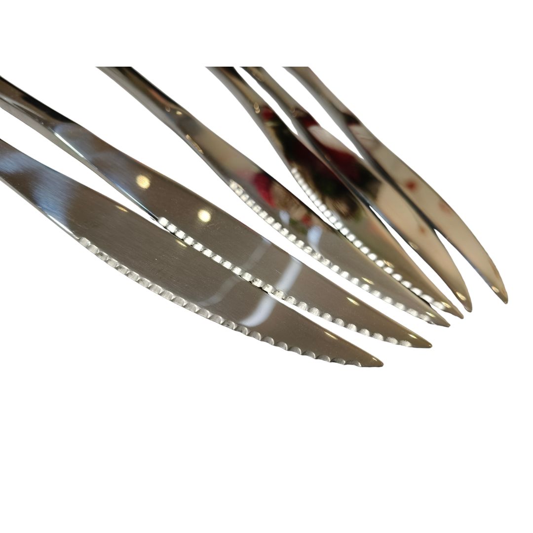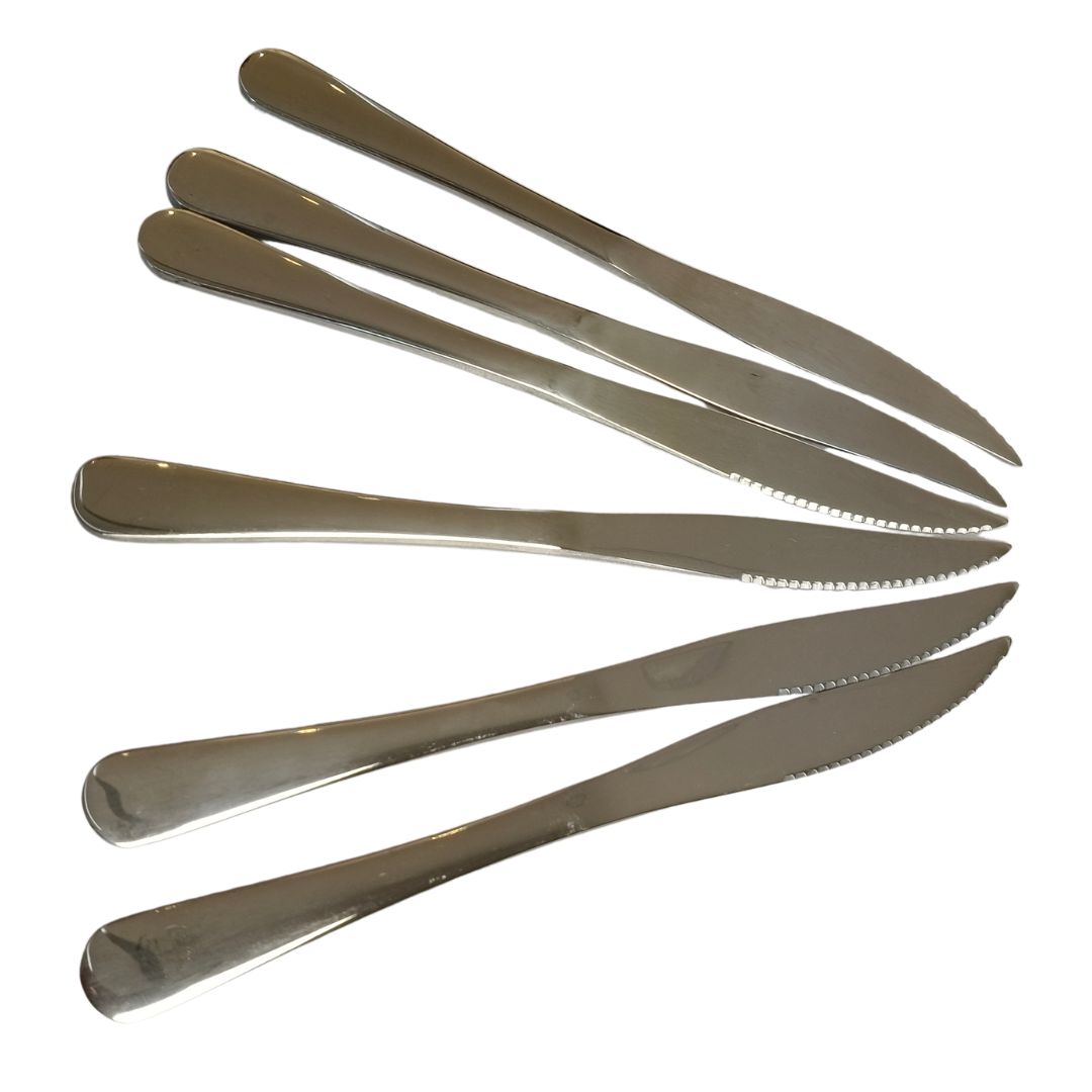 Una sola pieza fabricada en acero inoxidable, con hoja dentadas dimensiones aproximadas de 2 cm de alto, 2 cm de ancho y 22 cm de largo total (hoja de 11 cm), ideales para cortar carnes, pan y alimentos de textura firme en el hogar o restaurante.