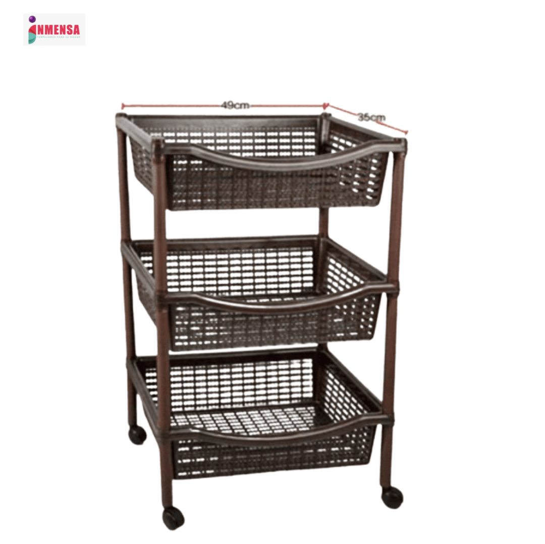 ESTANTE LUXUS CAFE INMENSA REF:F90717;  estante portátil de 3 niveles fabricado en plástico resistente tipo polipropileno, con dimensiones aproximadas de 80 cm de alto, 49 cm de ancho y 35 cm de largo, en color café y marca INMENSA. Incluye tres canastas tipo rejilla con estructura firme y ruedas inferiores para facilitar su desplazamiento, ideal para optimizar espacios reducidos. Su capacidad permite almacenar frutas, productos de despensa, accesorios de baño, ropa pequeña o utensilios diversos. Es un producto portátil y desarmable, adecuado para usar en cocina, baño, lavandería o habitaciones.