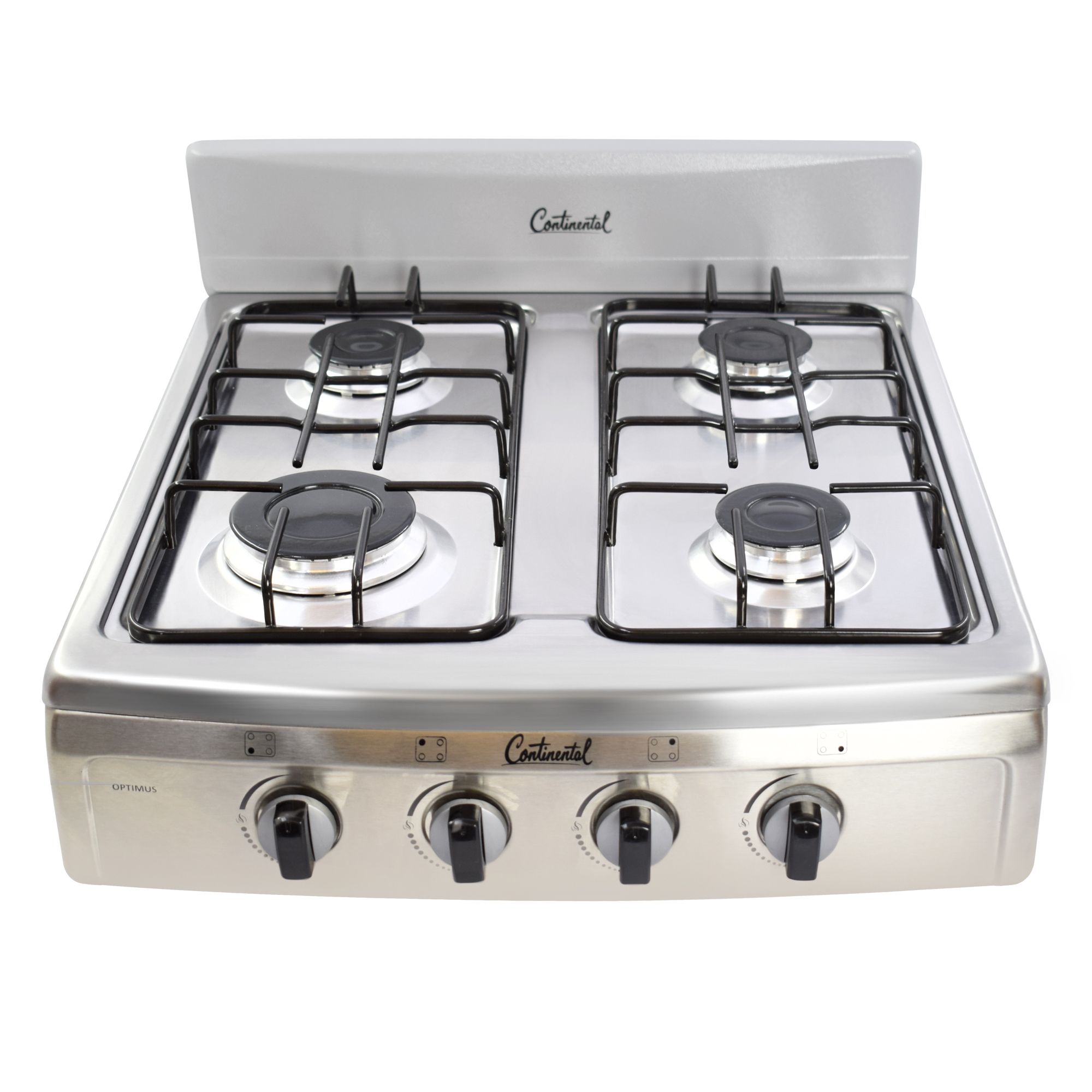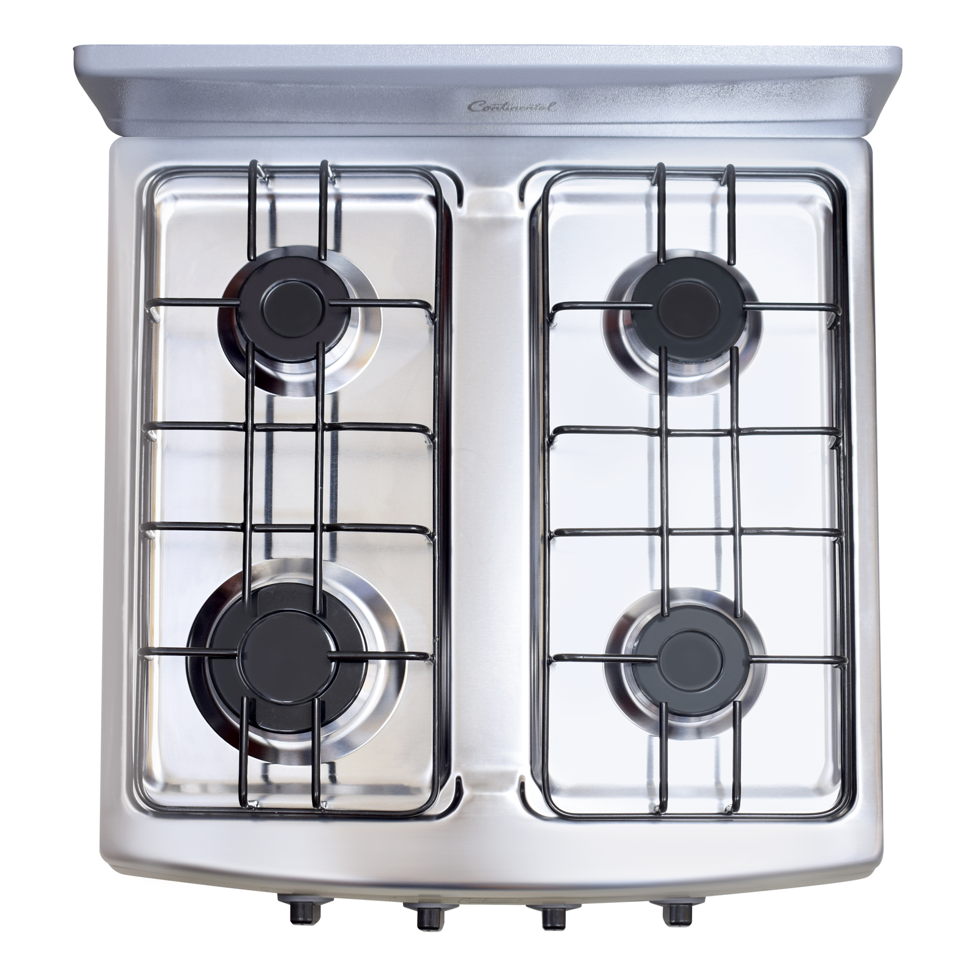 ESTUFA REF 4886 CONTINENTAL GAS 4 PT LUJO Q.AL A.E GN FULL A.INOX; Mide 15 cm de alto, 58 cm de ancho y 53 cm de largo, con acabado plateado brillante y perillas plásticas negras ergonómicas. Posee 4 quemadores (3 semi-rápidos y 1 rápido) que optimizan la cocción y distribuyen el calor uniformemente. diseñada para un desempeño eficiente y duradero. Fabricada totalmente en acero inoxidable calibre 24, resistente a altas temperaturas y de fácil limpieza. Su estructura es tipo sobremesa y cuenta con parrillas porcelanizadas que ofrecen mayor firmeza y resistencia. Ideal para cocinas domésticas o comerciales, brinda un bajo consumo de gas natural y excelente rendimiento energético. Se recomienda limpiar con esponja suave y jabón neutro para conservar su brillo y prolongar su vida útil.