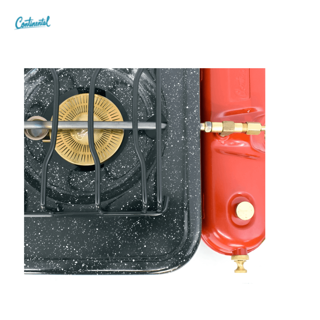 ESTUFA REF 6095 GASOLINA 2 PUESTOS CONTINENTAL; Sus dimensiones aproximadas son 13 cm de alto, 37 cm de ancho y 68 cm de largo, con un peso de 5 kg. Incluye un tanque metálico rojo con capacidad de 0,75 litros que garantiza tiempos prolongados de cocción sin recargas frecuentes. fabricada en lámina cold rolled calibre 24 esmaltada con pintura porcelanizada de alta resistencia, ofrece durabilidad y excelente desempeño En color gris con detalles rojos, su diseño compacto y portátil la hace ideal para uso en exteriores, campamentos o zonas rurales. Dispone de quemadores de bronce y válvulas seguras que evitan fugas de combustible, proporcionando una cocción eficiente y segura