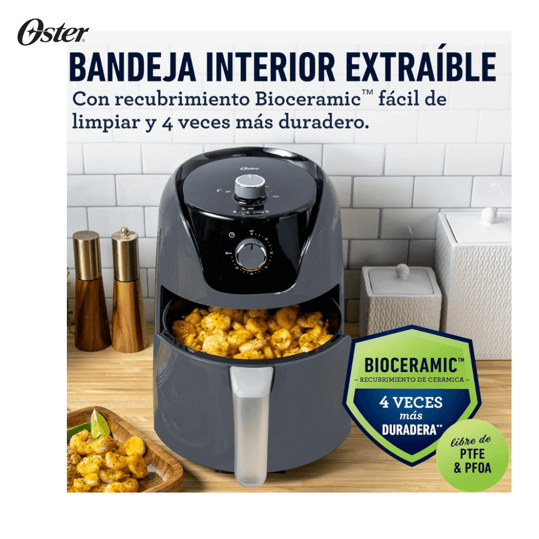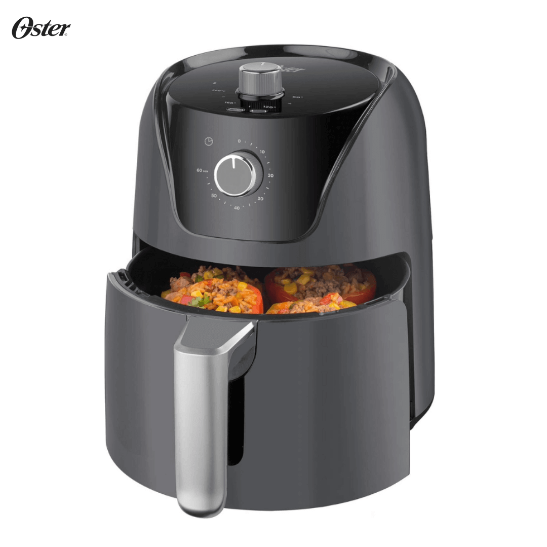 FREIDORA DE AIRE OSTER 4 LITROS; ideal para porciones familiares, y dimensiones de 35 cm de alto × 32 cm de ancho × 32cm de largo en color negro equipo eléctrico de cocina fabricado en plástico resistente con componentes internos metálicos, diseñado para freír, asar u hornear alimentos con poco o nada de aceite. Cuenta con una capacidad de 4 litros, Incorpora control manual de temperatura y tiempo, cesta extraíble con recubrimiento antiadherente y estructura portátil para ubicar en encimeras de cocina. Su tecnología de circulación de aire caliente permite obtener cocciones uniformes y rápidas, facilitando además una limpieza sencilla y segura tras cada uso. Control de temporizador ajustable de hasta 60 minutos,