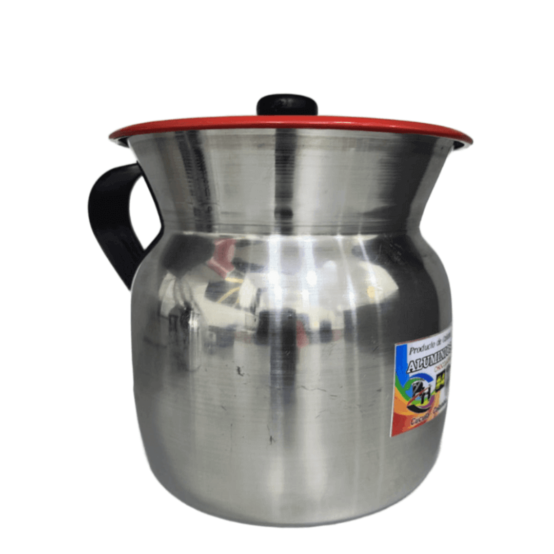 JARRA CHOCOLATERA 4 CON TAPA COLOR ALUMINIOS RH;Jarra chocolatera #4 con tapa color aluminio RH, fabricada en aluminio resistente y liviano, con dimensiones aproximadas de 16.5 cm de alto, 16.5 cm de ancho y 16.5 cm de largo. Incluye tapa ajustada con borde color rojo para conservar mejor el calor y asa ergonómica en aluminio con capa de pintura negra que facilita un agarre seguro durante el manejo. Posee una sola cavidad de preparación y una capacidad aproximada entre 1.5 y 2 litros, ideal para calentar o servir bebidas calientes como chocolate o atole. Tipo de producto portátil, de fácil manipulación y traslado.