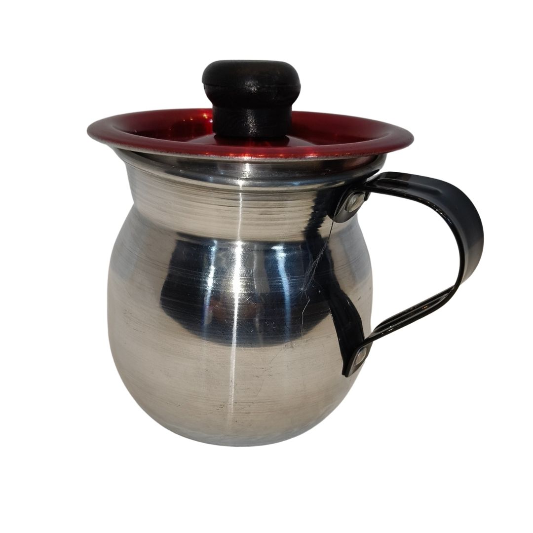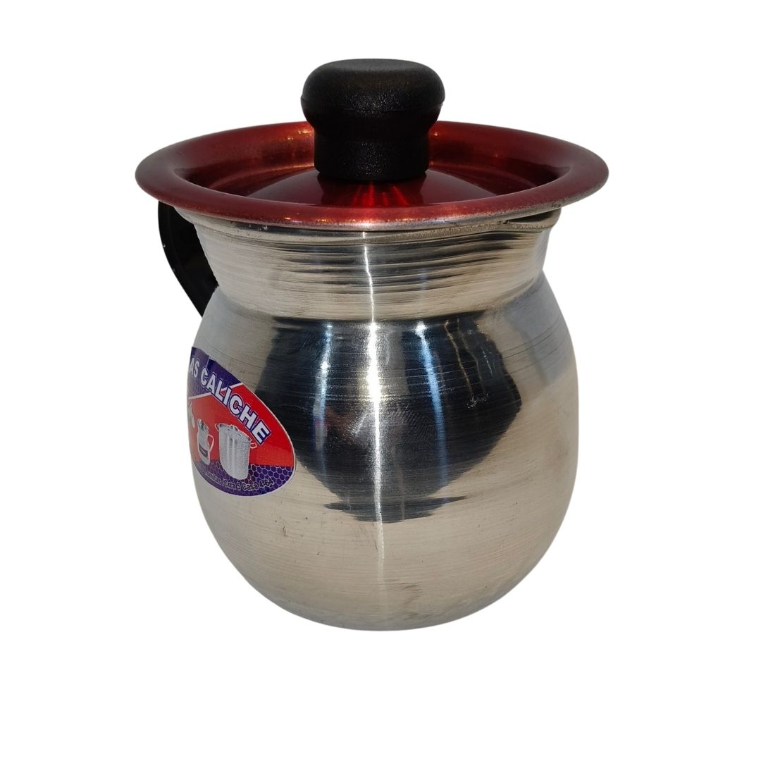 JARRA CHOCOLATERA CALICHE 500 ML CON TAPA DE ALUMINIO, jarra tradicional de uso doméstico fabricada en aluminio pulido de alta resistencia, ideal para preparar y servir chocolate, café, agua de panela u otras bebidas calientes. Presenta dimensiones de 10 cm de alto, 7.5 cm de ancho y 14 cm de largo, en color aluminio natural con tapa superior de aluminio y pomo plástico resistente al calor. , ideal para preparar y servir chocolate, café, agua de panela u otras bebidas calientes.
