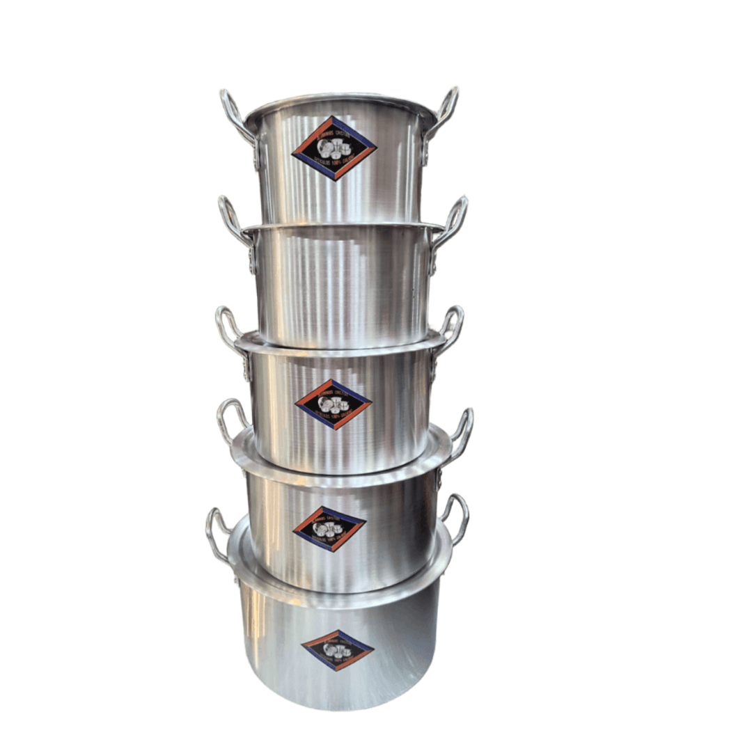 JUEGO DE CALDERO 14-22 TAPA PULIDA CR; abricado en aluminio de alta resistencia con acabado pulido, ideal para una conducción uniforme del calor. Cada olla cuenta con dos asas laterales reforzadas y diseño apilable, permitiendo optimizar espacio en la cocina. El set incluye 5 niveles o compartimientos, correspondientes a las cinco ollas de diferentes tamaños, con dimensiones aproximadas de 18 cm a 32 cm de diámetro y alturas entre 12 cm y 20 cm según el tamaño. De color aluminio natural ofrece capacidades variables entre 3 litros y 15 litros, perfectas para preparar desde porciones pequeñas hasta grandes volúmenes de alimentos. Su tipo de producto es portátil y apilable, ideal para uso en cocinas domésticas, restaurantes, cafeterías o negocios de comida