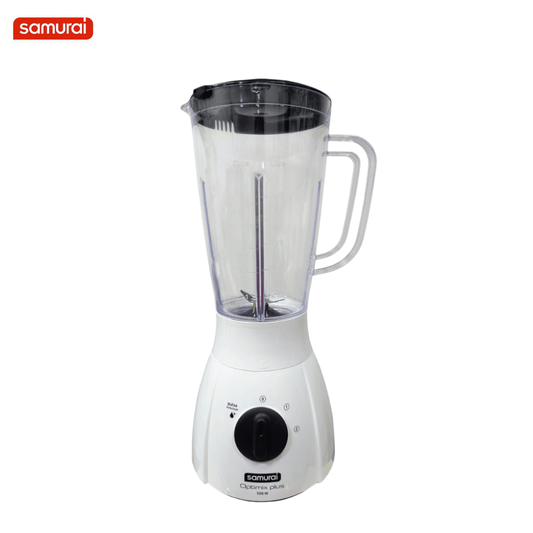 LICUADORA SAMURAI OPTIMIX PLUS BLANCA REF 5861022077; Con dimensiones de 31 cm de alto, 25 cm de ancho y 19 cm de largo, equipada con vaso plástico de alta en policarbonato resistencia y capacidad de 2 litros, ideal para preparar jugos, batidos o salsas con eficiencia. Incorpora motor de 550 W, 2 velocidades y función pulso para ajustar la textura según la preparación. Su sistema de acople en Carbon Drive ofrece una durabilidad dos veces mayor, y sus cuchillas ZELKROM de acero inoxidable mantienen el filo por más tiempo. esta licuadora de color blanco y marca SAMURAI es un electrodoméstico esencial para uso doméstico en cocina, garantizando potencia, practicidad y fácil limpieza.