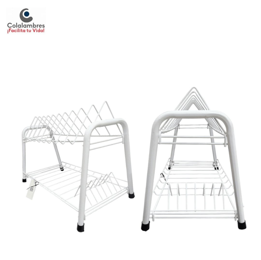 LOCERO DE TUBO 2 NIVELES COLOR BLANCO REF 008 COLALAMBRES; fabricado en estructura metálica tubular con pintura blanca resistente a la oxidación, ideal para uso doméstico en cocina. Sus dimensiones son 28 cm de alto, 53 cm de ancho y 35 cm de largo, con dos niveles diseñados para escurrir hasta 15 platos en la parte superior y vasos o utensilios en la inferior. De tipo fijo y compacto, brinda estabilidad y durabilidad frente a la humedad. Su diseño minimalista en color blanco facilita la limpieza y combina fácilmente con cualquier estilo de cocina, manteniendo el orden y aprovechando mejor el espacio.