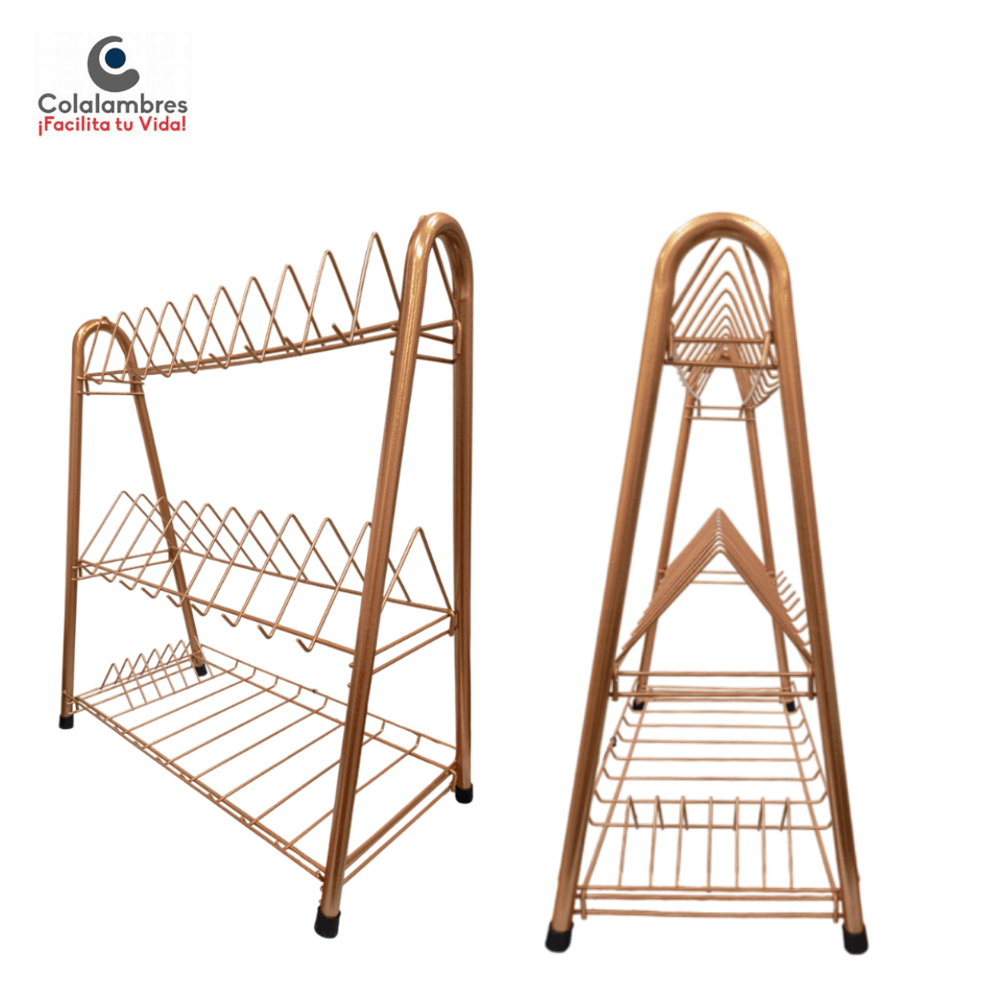 LOCERO DE TUBO 3 NIVELES ORO ROSA REF 549 COLALAMBRES; Sus dimensiones son 55 cm de alto, 53 cm de ancho y 35 cm de largo, con tres niveles que permiten organizar y escurrir hasta 20 platos en la parte superior, además de tazas y cubiertos en los niveles inferiores. elaborado en tubo metálico pintado con recubrimiento resistente a la humedad y la oxidación, ideal para uso en cocina. De tipo fijo y estable, ofrece gran durabilidad y soporte gracias a su estructura reforzada. Su elegante color oro rosa aporta un toque decorativo y moderno, combinando estilo y funcionalidad para mantener el área de lavado limpia y ordenada con facilidad.