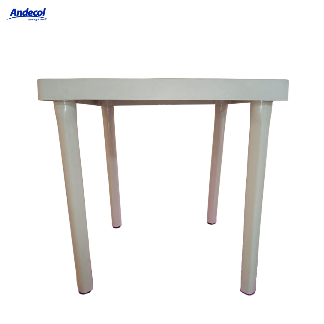 MESA CUADRADA CLASICA BLANCA ANDECOL – REF MP0276; fabricada en plástico de alta resistencia, con dimensiones de 75 cm de alto, 75 cm de ancho y 75 cm de largo. Presenta color blanco y diseño clásico sin niveles ni compartimientos, con capacidad para usar como mesa de comedor para 4 puestos. Es un producto fijo y liviano, ideal para interiores o exteriores gracias a su resistencia a la humedad y fácil limpieza. Recomendada para cocinas, comedores, terrazas o espacios sociales, permitiendo un uso práctico y estable; se sugiere limpiar con paño húmedo y jabón suave, y evitar golpes fuertes para prolongar su vida útil.