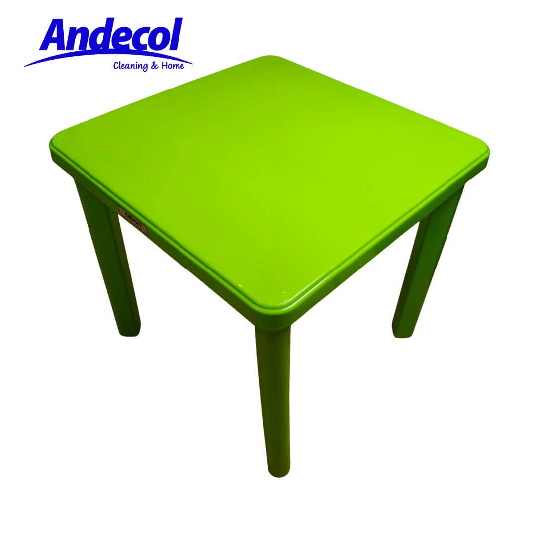 MESA KINDER CUADRADA ANDECOL, fabricada en plástico resistente de alta calidad en polipropileno, dimensiones aproximadas de 50 cm de alto, 60 cm de ancho y 60 cm de largo, capacidad para 2 a 4 niños, en color VERDE LIMON, ideal para brindar estabilidad y fácil mantenimiento tanto en interiores o exteriores.