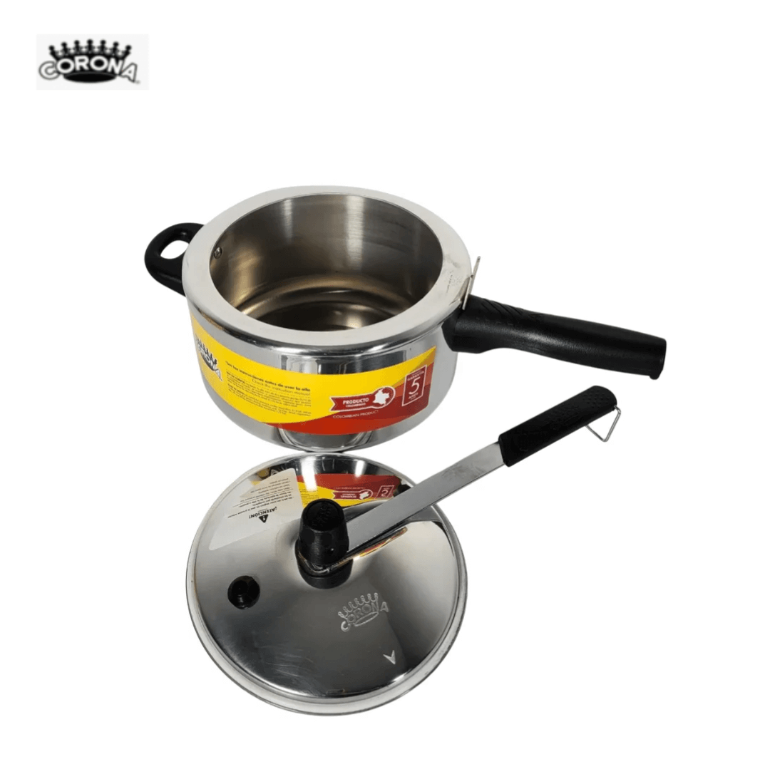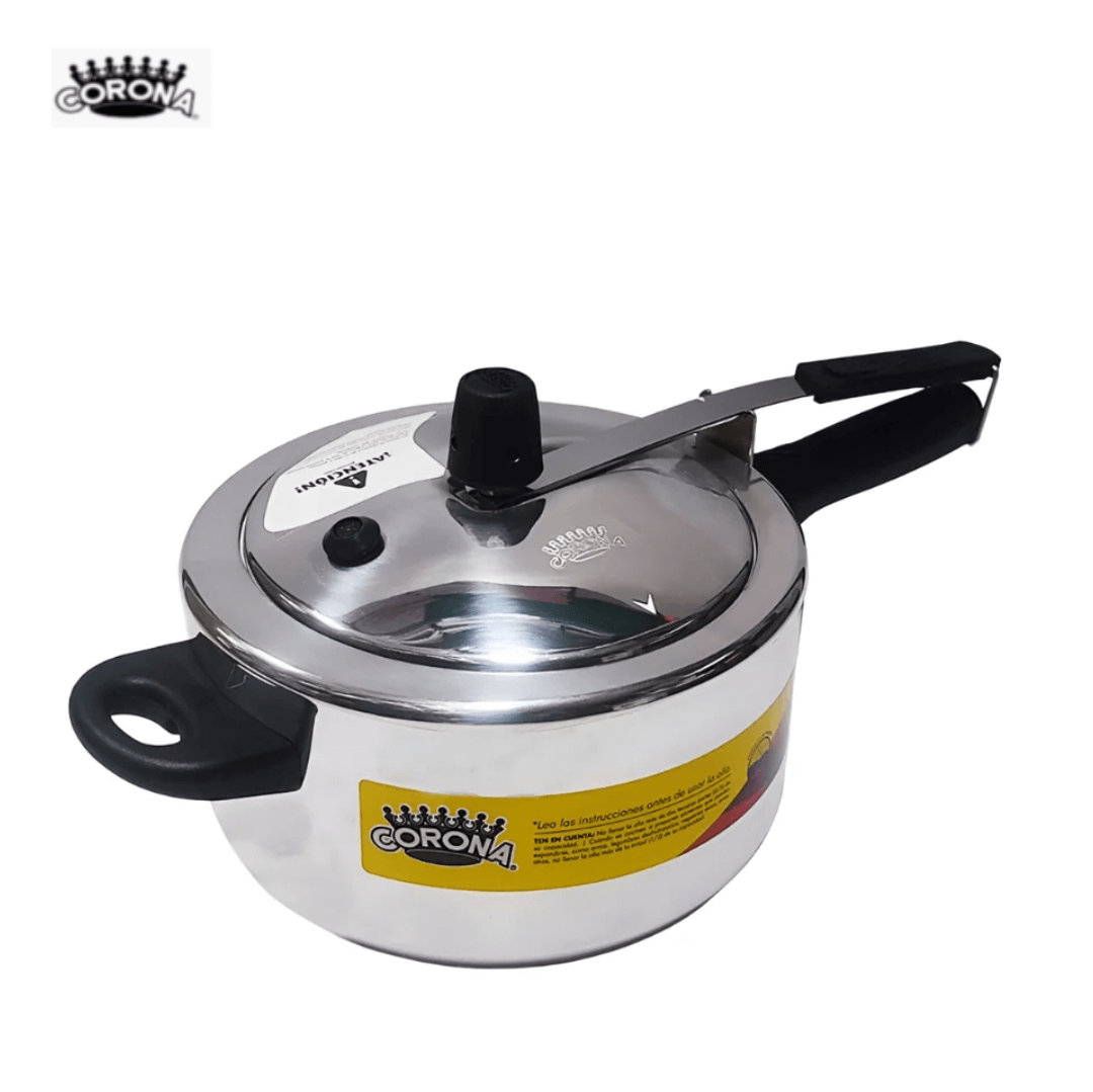 OLLA A PRESION 2 LITROS CORONA REF: L22201; fabricada en aluminio liviano y resistente, con dimensiones aproximadas de 15 cm de alto, 20 cm de ancho y 33 cm de largo. Su diseño incluye mangos remachados en baquelita negra que aíslan el calor y una tapa hermética con cierre automático y válvula de seguridad, garantizando una cocción rápida y segura. Con capacidad de 2 litros, es ideal para preparar porciones pequeñas de carnes, legumbres o sopas. Su estructura ofrece una excelente conducción térmica, siendo perfecta para el uso diario en cocinas domésticas a gas o eléctricas