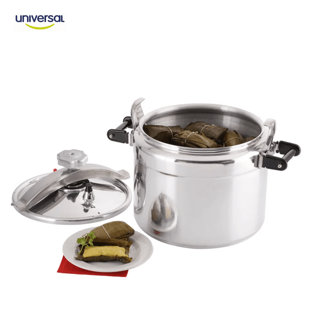 OLLA APRESION UNIVERSA MAGNA 15 REF L93015; Mide 42 cm de alto, 27 cm de ancho y 26 cm de largo, con acabado plateado metálico. de gran capacidad y alto rendimiento, ideal para cocinas institucionales, restaurantes o comedores industriales. Fabricada en aluminio de alta resistencia (85%) con componentes en acero inoxidable y silicona que garantizan durabilidad y hermeticidad, Su capacidad de 15 litros permite preparar grandes volúmenes de alimentos en menor tiempo. Incorpora 2 válvulas de seguridad, asas reforzadas con metal, y sistema de pesas reguladoras que controlan la presión interna para una cocción uniforme y segura. De tipo industrial, está diseñada para resistir trabajo continuo y altas temperaturas, asegurando eficiencia en procesos culinarios profesionales. Se recomienda lavar con esponja suave y jabón neutro, evitando utensilios abrasivos para conservar el brillo del aluminio.