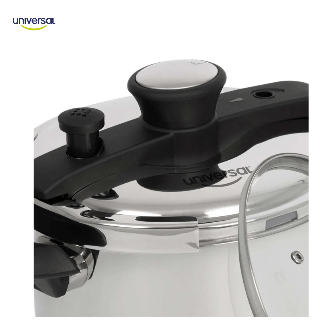 OLLA APRESION UNIVERSAL EASY CLICK 6 LITROS + TAPA VIDRIO REF; L37770; Sus dimensiones aproximadas son 25 cm de alto, 26 cm de ancho y 28 cm de largo, con capacidad de 6 litros ideal para preparar comidas familiares fabricada en acero inoxidable de alta calidad con tapas intercambiables (una de presión y otra de vidrio templado), combina durabilidad y funcionalidad en un solo diseño. En color plateado, cuenta con asas en baquelita negra ergonómicas que aíslan el calor y facilitan su manipulación. Incorpora 5 sistemas de seguridad visibles que garantizan un uso confiable en cocinas de gas o eléctricas. Su diseño distribuye el calor de forma uniforme, optimizando tiempos de cocción y conservando mejor los nutrientes.