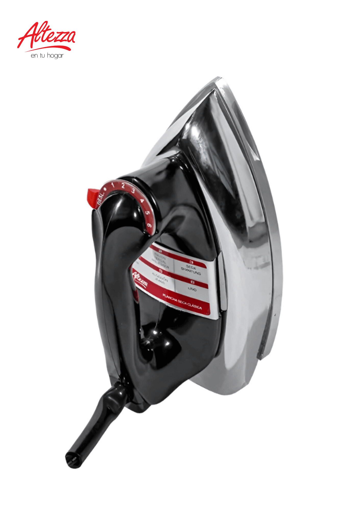 PLANCHA SECA CLASICA ALTEZZA REF ADI-1000A; fabricada con base de aluminio pulido de alta resistencia que garantiza un deslizamiento uniforme y calor constante. Mide 12,5 cm de alto, 12 cm de ancho y 24 cm de largo, con diseño ergonómico y acabado negro con detalles metálicos. Cuenta con control de temperatura ajustable que se adapta a diferentes tipos de tela, permitiendo un planchado eficiente y seguro. Su estructura robusta ofrece potencia de calentamiento rápido para eliminar arrugas difíciles en menos tiempo. Ideal para uso doméstico en la lavandería o área de planchado, brindando resultados profesionales en cada prenda.