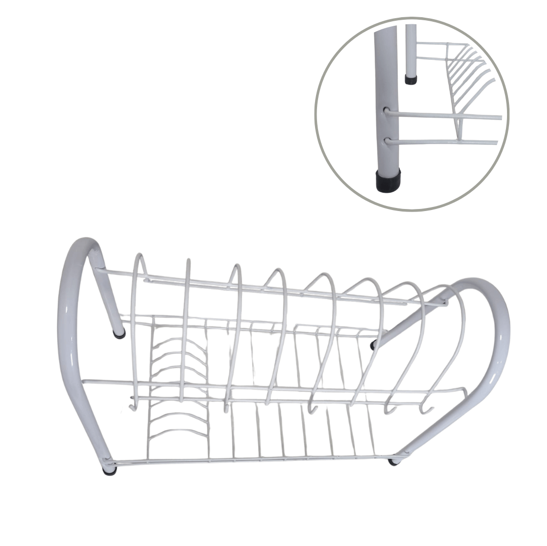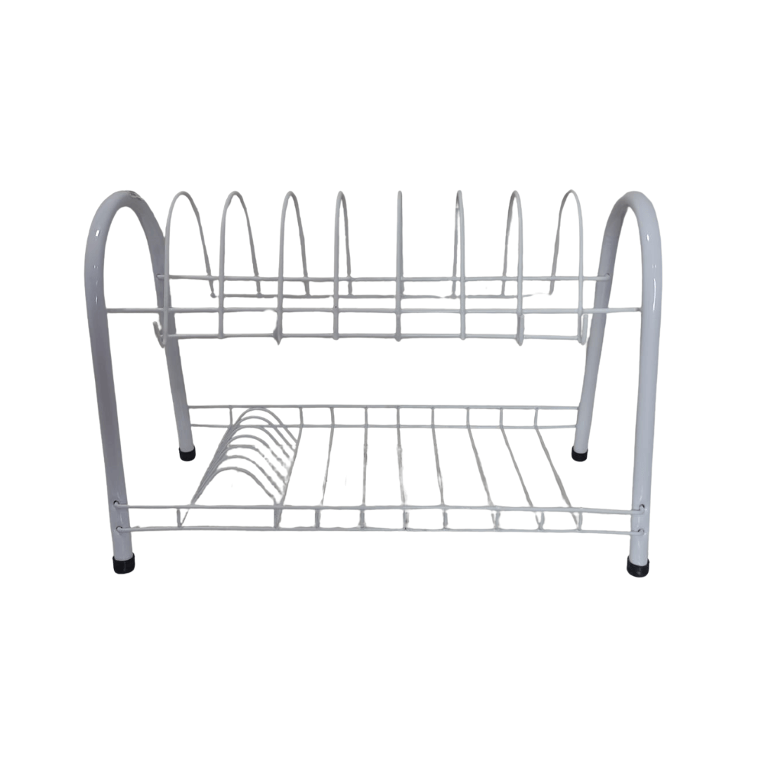 Es un escurridor de platos metálico de dos niveles, diseñado para organizar y secar vajillas, vasos y cubiertos después del lavado. Su estructura combina funcionalidad y un diseño moderno con detalles en color blanco, ideal para organizador tu cocina, estructura metálica pintada con recubrimiento anticorrosivo, 2 niveles