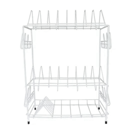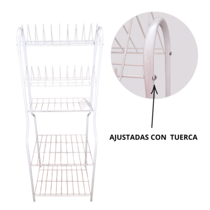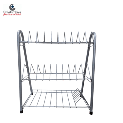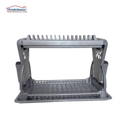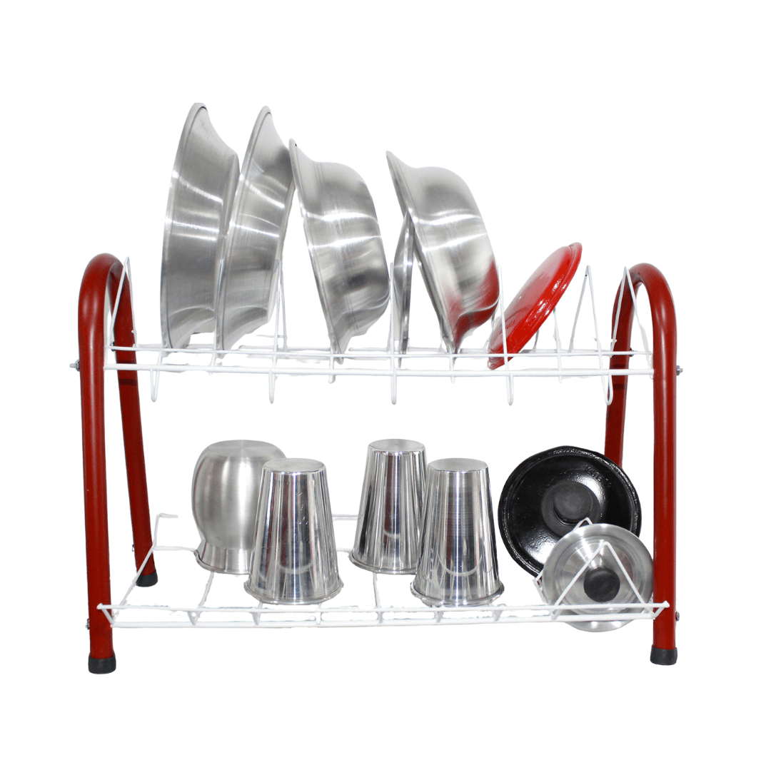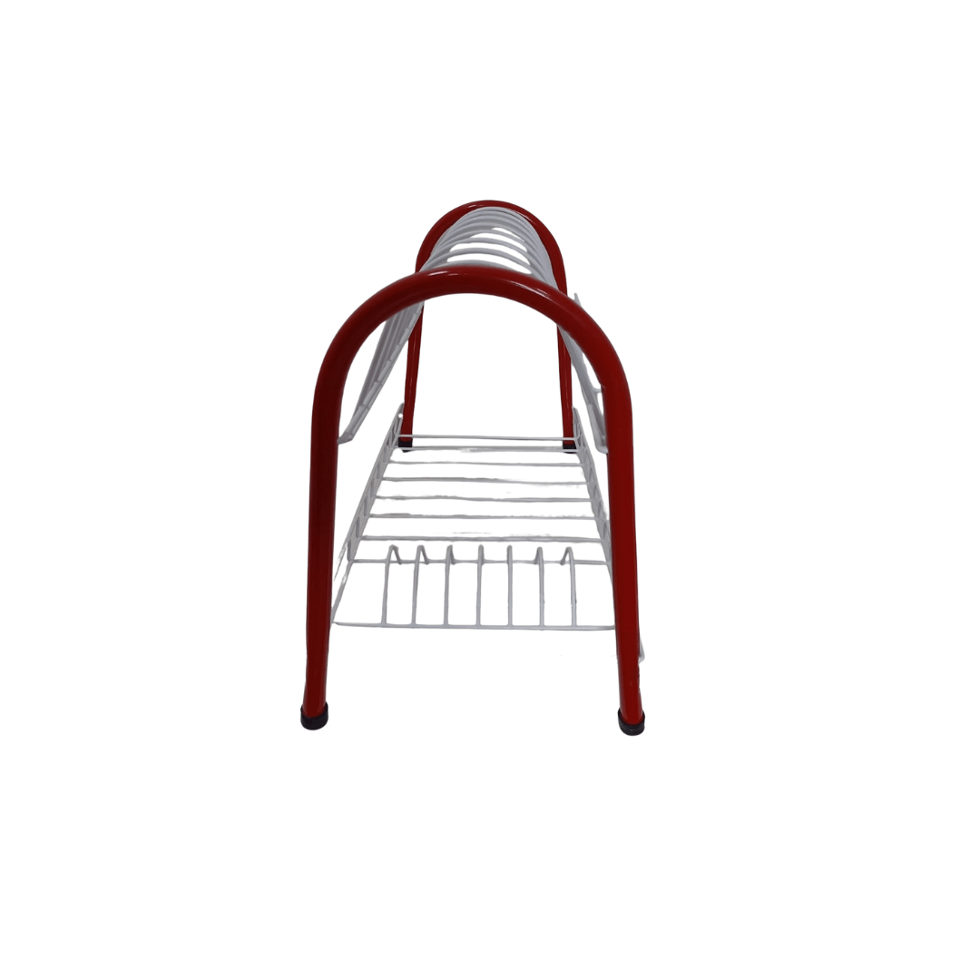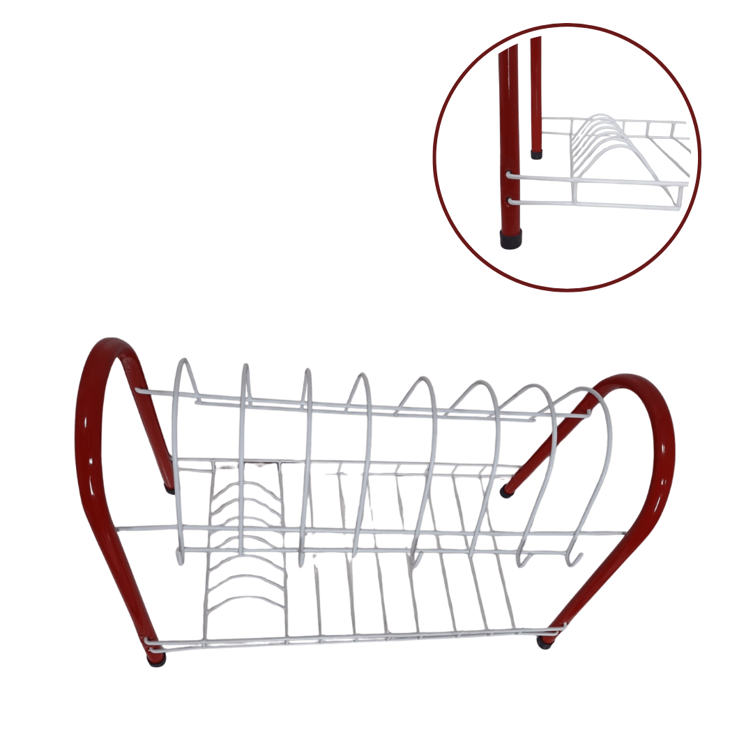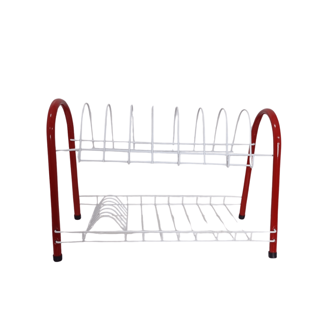 Es un escurridor de platos metálico de dos niveles, diseñado para organizar y secar vajillas, vasos y cubiertos después del lavado. Su estructura combina funcionalidad y un diseño moderno con detalles en color rojo y blanco, ideal para organizador tu cocina, estructura metálica pintada con recubrimiento anticorrosivo, 2 niveles,Nivel superior: Soporte para platos (con divisiones semicirculares) Nivel inferior: Superficie plana para tazas, vasos o recipientes Diseño: Patas arqueadas con base antideslizante (tapones de goma negra) Estructura estable y de fácil limpieza Uso recomendado: Cocina, fregadero, organización de platos y utensilios Capacidad estimada: Aproximadamente 10–12 platos en el nivel superior y varios vasos o recipientes en el inferior