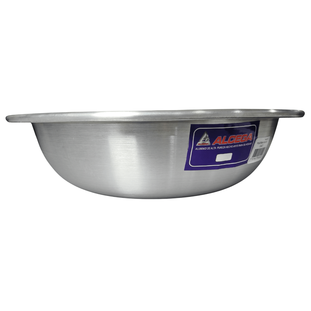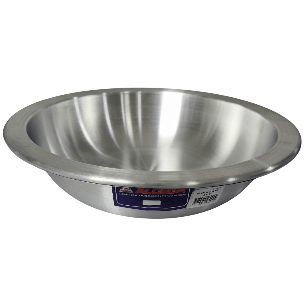 fabricado en acero inoxidable resistente a la corrosión, con dimensiones aproximadas de 9 cm de alto, 34 cm de ancho, 34 cm de largo, capacidad aproximada de 3.4 litros. Ideal para mezclar, servir o almacenar alimentos gracias a su estructura liviana y fácil de limpiar