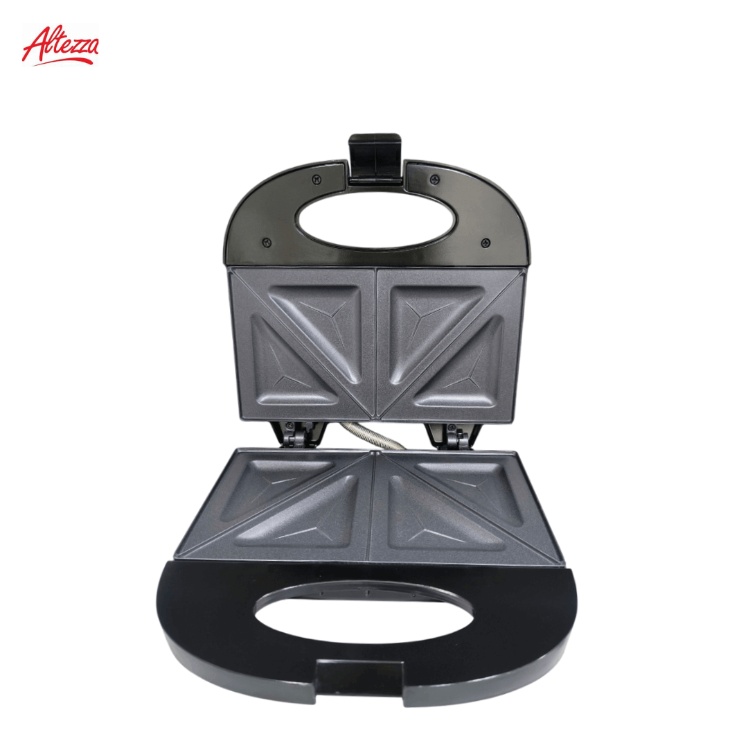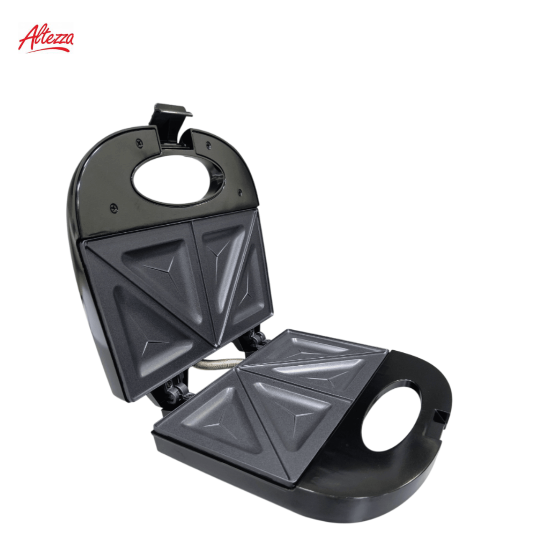 SANDUCHERA ALTEZZA DOS PUESTOS NEGRA REF 45693 ASM-817BL; práctica y compacta, diseñada para preparar 2 sándwiches simultáneamente gracias a sus placas triangulares antiadherentes que garantizan una cocción pareja y una limpieza rápida. Cuenta con dimensiones de 9 cm de alto, 23 cm de ancho y 22 cm de largo, color negro, marca Altezza, y estructura tipo portátil con cierre seguro y mango ergonómico frío al tacto. Fabricada en plástico resistente con placas metálicas antiadherentes, permite un uso cómodo y seguro en la cocina para desayunos y comidas ligeras. Sus indicadores luminosos facilitan el control del encendido y la temperatura, y su base antideslizante evita movimientos durante el uso.