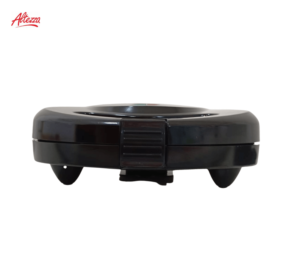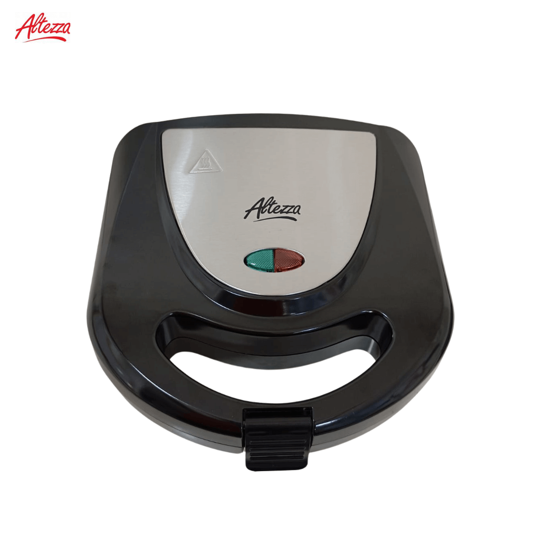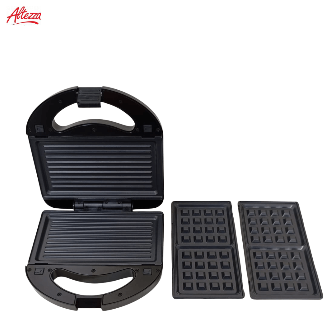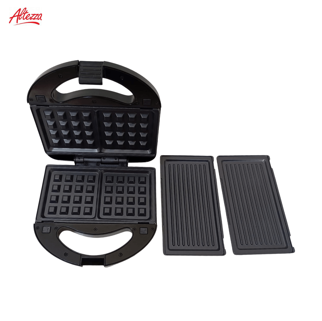 SANDUCHERA MULTIFUNCIONAL ALTEZZA 3 EN 1 REF; AWM-815BL; SUPER práctica y compacta, diseño 3 en 1 para preparar 2 sándwiches simultáneamente y parrilla grill gracias a sus placas triangulares antiadherentes que garantizan una cocción pareja y una limpieza rápida. Cuenta con dimensiones de 9 cm de alto, 23 cm de ancho y 22 cm de largo, color negro, marca Altezza, y estructura tipo portátil con cierre seguro y mango ergonómico frío al tacto. Fabricada en plástico resistente con placas metálicas antiadherentes, permite un uso cómodo y seguro en la cocina para desayunos y comidas ligeras. Sus indicadores luminosos facilitan el control del encendido y la temperatura, y su base antideslizante evita movimientos durante el uso.