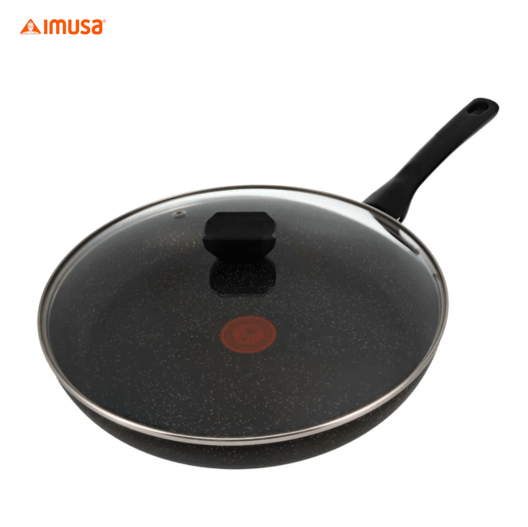 SARTEN IMUSA AT 30 CM TV A/A FORCE REF: 5861034484; fabricado en aluminio con recubrimiento antiadherente Titanium 6X de alta resistencia, con dimensiones de 6 cm de alto, 30 cm de ancho y 49 cm de largo incluyendo el mango. Presenta color negro, marca IMUSA, sin niveles ni compartimientos, con capacidad para preparar porciones de uso doméstico o institucional. Es un sartén fijo con tapa de vidrio templado y mango ergonómico de agarre seguro. Ideal para usar en la cocina para freír, saltear o cocinar con mínimo aceite, gracias a su tecnología termo-señal que indica el momento ideal de cocción y su base difusora que distribuye el calor de forma uniforme; se recomienda usar utensilios de silicona o madera y limpiar con esponja suave para prolongar su vida útil.