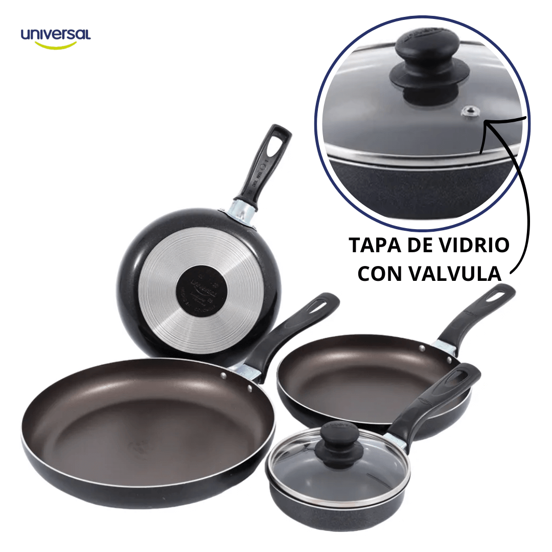 SET X 5 SARTENES ALIADA 18-20-24 + CACEROLA 12 DE TAPA DE VIDRIO REF; L39685; compuesto por una cacerola de 12 cm con tapa de vidrio y sartenes de 18 cm, 20 cm y 24 cm, ideal para cocinar con practicidad y resultados homogéneos. Fabricado en aluminio de alta resistencia con recubrimiento antiadherente de 4 capas, soporta hasta 5.000 ciclos de abrasión, garantizando durabilidad y fácil limpieza. Su color gris grafito con interior oscuro brinda una apariencia moderna y elegante. Diseñado para uso doméstico en cocina, distribuye el calor de forma uniforme permitiendo cocinar con menos aceite y conservar el sabor de los alimentos. Su estructura liviana y mangos ergonómicos termoaislantes ofrecen un manejo cómodo y seguro; se recomienda lavar con esponja suave y evitar utensilios metálicos para prolongar su vida útil.