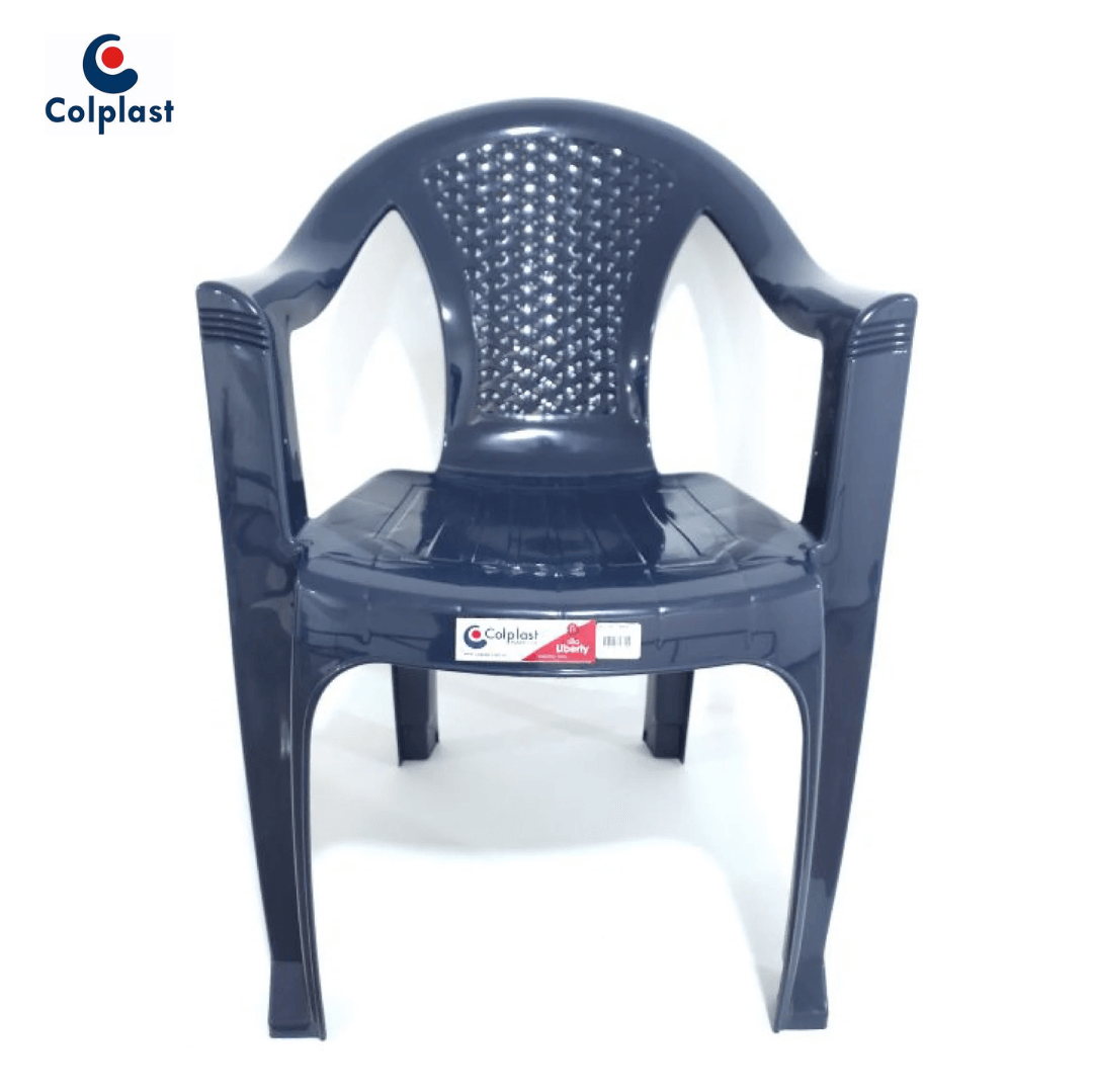 SILLA COLPLAST LIBERTY CON BRAZO AZUL OSCURO REF 100; silla monobloque de una sola pieza fabricada en plástico resistente tipo polipropileno, con dimensiones de 79 cm de alto, 56 cm de ancho y 52 cm de largo, en color azul oscuro y marca COLPLAST. Cuenta con apoyabrazos integrados y diseño ergonómico que brinda estabilidad y comodidad, soportando el uso frecuente en diferentes espacios. Es un producto portátil y ligero, ideal para salas, comedores, patios, terrazas o eventos, tanto en interiores como exteriores. Se recomienda usar sobre superficies firmes, evitar sobrecargar con peso excesivo y limpiar con paño húmedo para mantener su durabilidad, apariencia y resistencia al desgaste