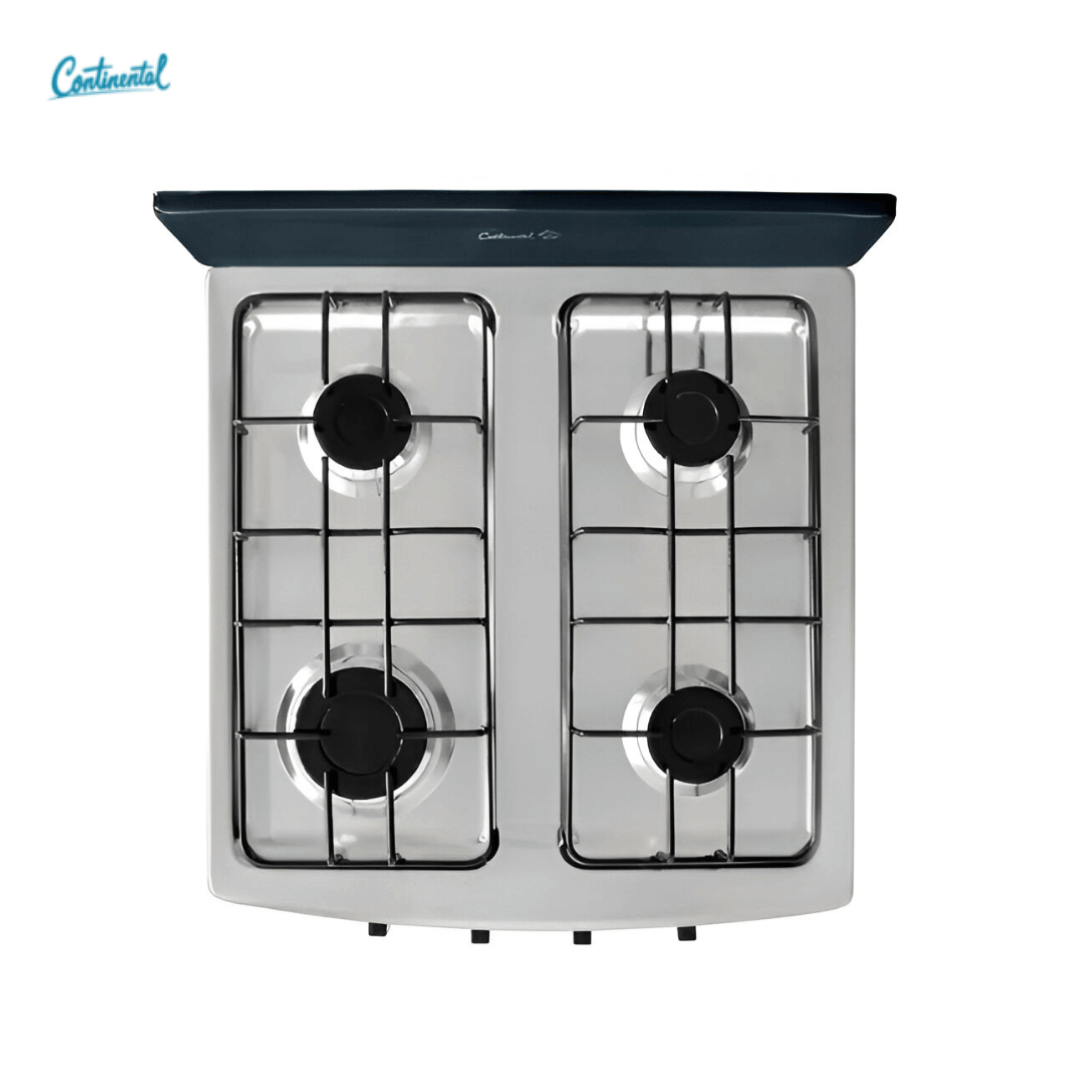 SOBREMESA REF 4947 CONTINENTAL 4PT LUJO MESA Y FRENTE ACERO INOX Q.AL GP NEGRO; fabricada en acero inoxidable calibre 24, material resistente al calor y de fácil limpieza. Mide 15 cm de alto, 52,5 cm de ancho y 58,5 cm de largo, con acabado gris metálico y frente esmaltado en negro. Cuenta con 4 quemadores (3 semi–rápidos y 1 rápido) que permiten una cocción uniforme y eficiente con gas natural. Su parrilla superior esmaltada otorga firmeza y durabilidad, evitando deformaciones por temperatura. De encendido manual y tipo sobremesa, es ideal para cocinas domésticas o comerciales que buscan rendimiento y bajo consumo. Se recomienda limpiar con esponja suave y jabón neutro para conservar su brillo y prolongar su vida útil.