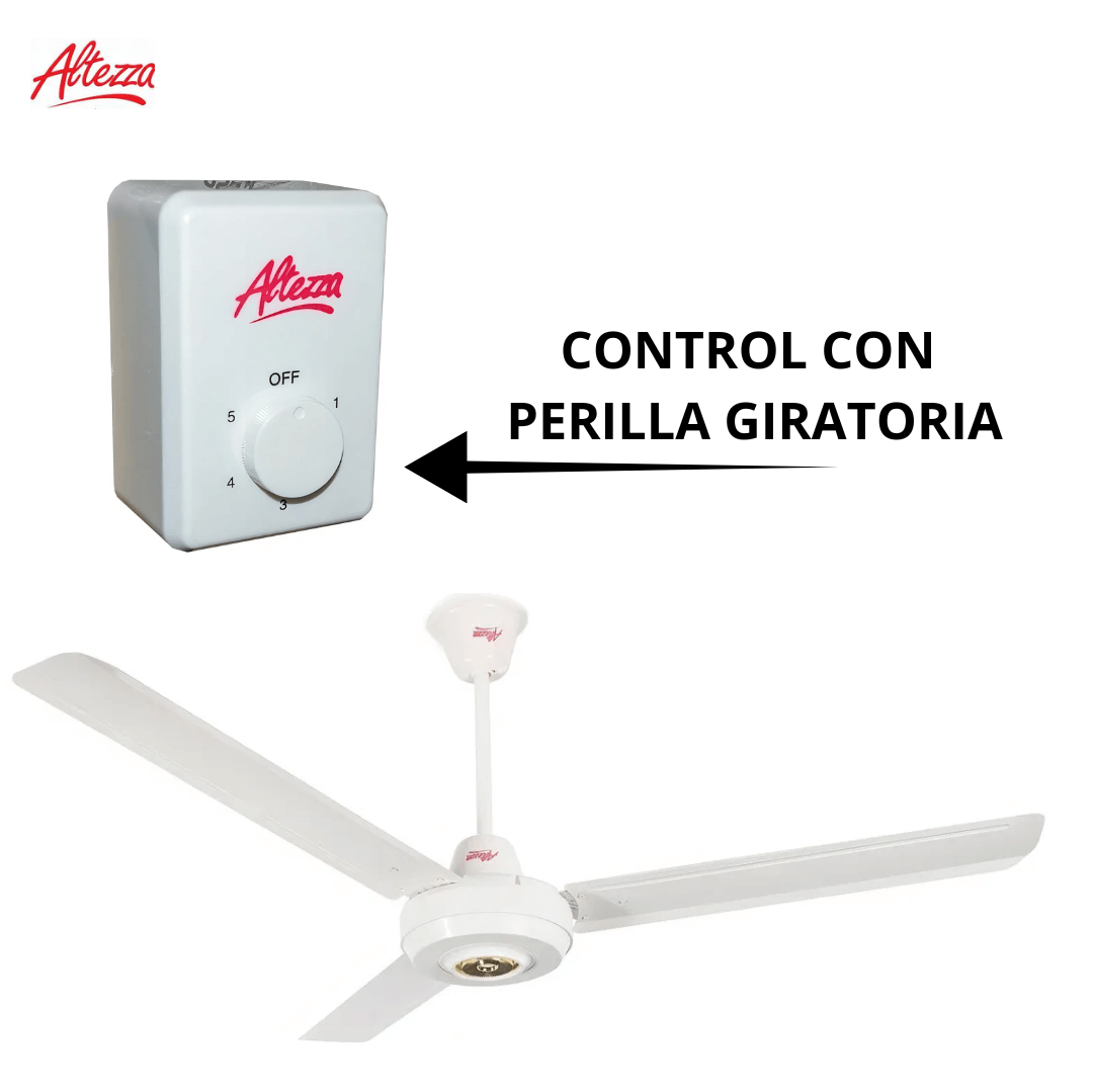 VENTILADOR ALTEZZA DE TECHO ACF-130 INDUSTRIAL BLANCO 56 PLG REF; 77516; fabricado con 3 hélices metálicas rectas y acabado en color BLANCO diseñado para brindar una circulación de aire eficiente y silenciosa. Cuenta con diámetro total de 142 cm (56 pulgadas), altura aproximada de 40 cm y estructura robusta de acero pintado con motor de 16 polos y potencia de 80 watts para un rendimiento continuo y duradero. Incorpora doble balinera que mejora la rotación y control de pared con 5 velocidades para ajustar el flujo de aire según la necesidad. Ideal para espacios amplios como salas, oficinas o habitaciones, su diseño decorativo combina funcionalidad y estilo, proporcionando confort térmico y un ambiente fresco durante todo el día.
