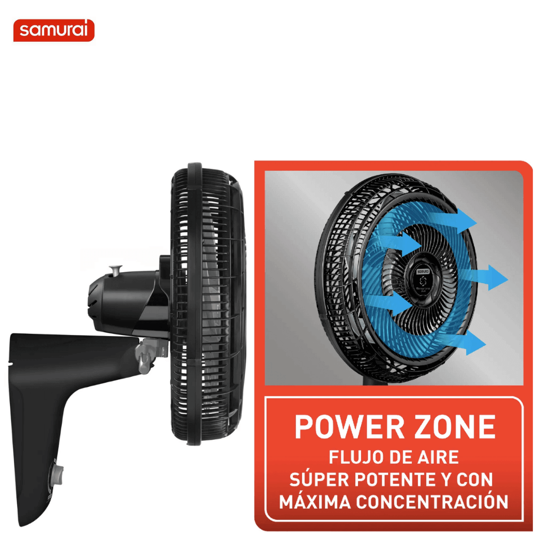 VENTILADOR SAMURAI SILENCE FORCE PLUS PARED NEGRO REF 5861032667: con dimensiones de 50 cm de alto, 30 cm de ancho y 50 cm de largo. Presenta color negro, marca SAMURAI, sin niveles ni compartimientos y con capacidad de ventilación mediante 6 aspas aerodinámicas de 18″. Es un ventilador fijo y portátil en instalación, diseñado para brindar mayor concentración de aire gracias a su tecnología Power Zone. Ideal para uso en habitaciones, salas, oficinas o cocinas; ofrece 3 velocidades, oscilación horizontal de 90° e inclinación vertical ajustable, asegurando mayor cobertura. Se recomienda instalarlo en pared firme a una altura segura, limpiar periódicamente su malla frontal removible y evitar ambientes húmedos para prolongar su durabilidad.